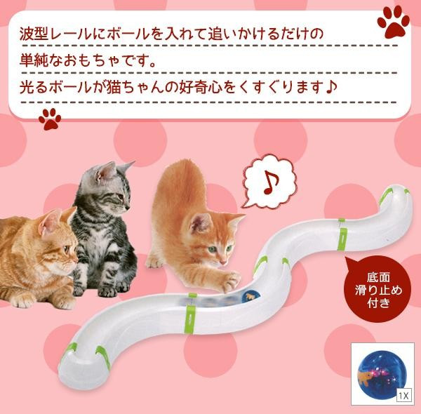 波型レールにボールを入れて追いかけるだけの単純なおもちゃです。光るボールが猫ちゃんの好奇心をくすぐります♪