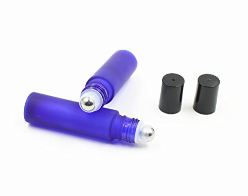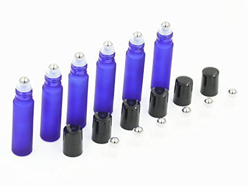 - 6, Frosted Cobalt Blue Glass Roll on bottles with stainless steel roller balls & black caps.