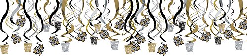 Studio : TradeMart Inc. Publisher : TradeMart Inc. Binding : Toy Product Description Give your New Year's Eve party a little star power with our Black, Gold Silver New Year's Swirl Decorations. Hang from the ceiling or in a doorway for an instant flurry of fun. 0