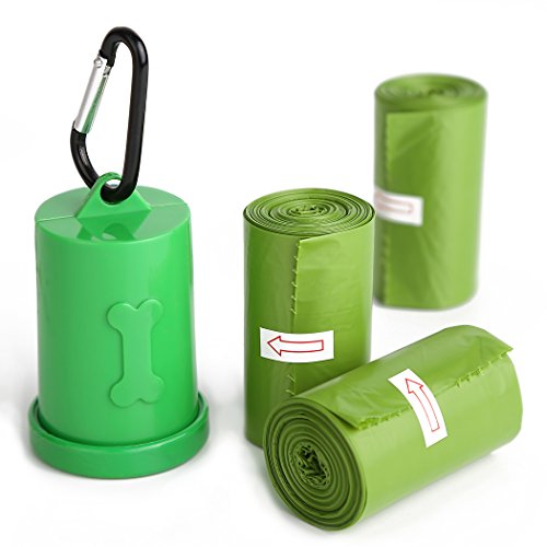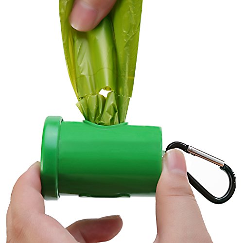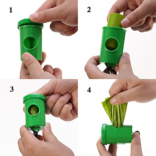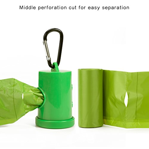 1. Middle perforation cut design makes each bag quickly separate and open. 2. Durable stylish green dispenser with a sturdy metal leash clip is easy to use by peeling off the lid, inserting a roll, pressing down the lid, and effortlessly detach a bag through the round hole. Securely attach the metal carabiner clip right onto a leash for easy access. 3. Quality sticker holding each roll is easy to remove without tearing the first bag. 4. Opaque green colored bags help mask the contents.