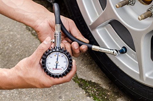 - HEAVY DUTY SOLID COMPONENTS / REINFORCED HOSE- Made to withstand leaks and allows for extended reach and flexibility to the valve. This mechanic grade tool is also shielded by a rugged rubber protective guard cover providing the tire gauge with extra protection from drops, knocks and scratches.