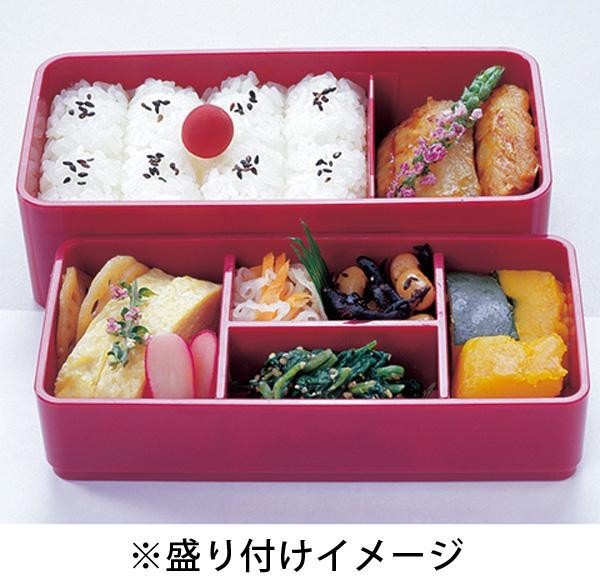 | ごはんがくっつきにくい表面加工の俵型おにぎり押型付。上段・下段とも小分けができる仕切り付きです。食事後は入れ子式でコンパクト収納可能♪ |