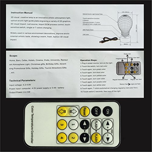 -. Feature : 7 Color: red,green,blue,yellow,cyan,pink and white,choose and enjoy your colorful life. / Remote control or One button operation, Press the touch button to last color, and then press it again, auto color changing. / Durable & Energy Saving:LED base including 9 hight light LED,USB powered,you can connect lamp with power by your mobile charger,computer,laptop,and any 5v usb plug(package exclude the plug). / The Perfect Gift: simple and stylish design,suit for birthday,anniversary,housewarming,graduation,engagement,valentines, romantic time and many other special occasions. / The 3D light is illuminated using LEDs that never get hot yet produce a warm glow. Because it's cold to the touch its perfect for children's bedrooms.