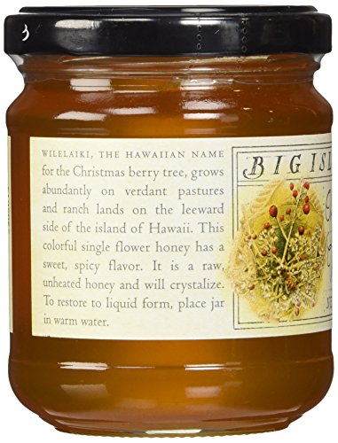 -. Binding : Misc. -. Brand : The Big Island Bee Company -. EAN : 0181457000093 -. Feature : With an ambrosial and subtle spicy flavor and a light amber color, Organic Wilelaiki Blossom honey is a favorite of gourmets and cooks for its versatility and flavorful finish / Also called "the Christmasberry blossom", Wilelaiki honey is difficult to find outside of South America / This raw, organic honey is unheated and unfiltered, to preserve the natural sugars and enzymes necessary for full-bodied flavor and complete nutrition -. IsAdultProduct : 0 -. Label : The Big Island Bee Company -. Manufacturer : The Big Island Bee Company -. NumberOfItems : 1 -. PackageQuantity : 1 -. ProductGroup : Grocery -. ProductTypeName : GROCERY -. Publisher : The Big Island Bee Company -. Size : 9 Ounces -. Studio : The Big Island Bee Company -. Title : Organic Wilelaiki Blossom Raw Honey by Big Island Bees (9 ounce) -. UPC : 181457000093