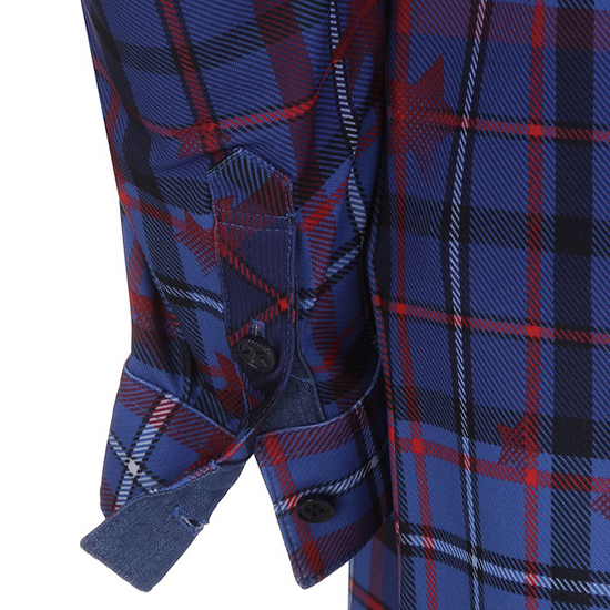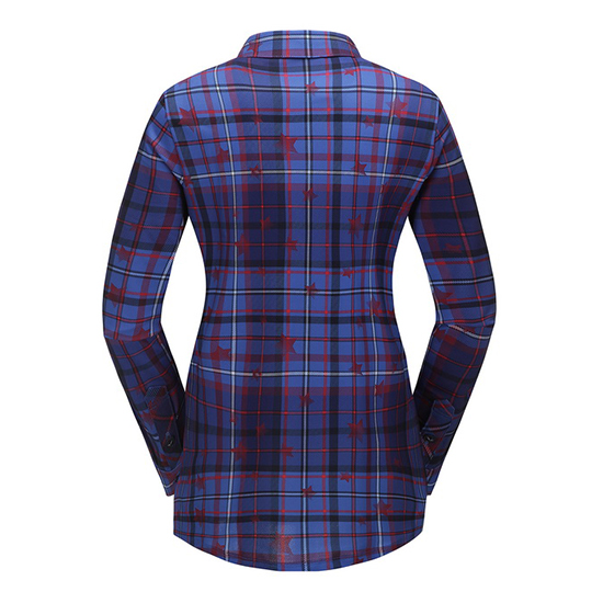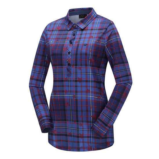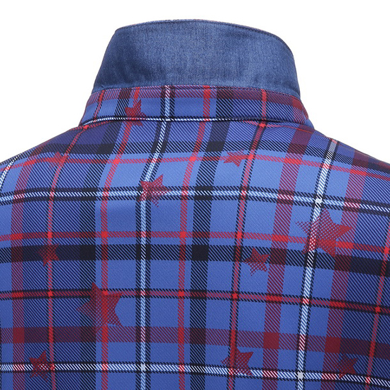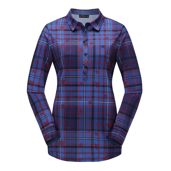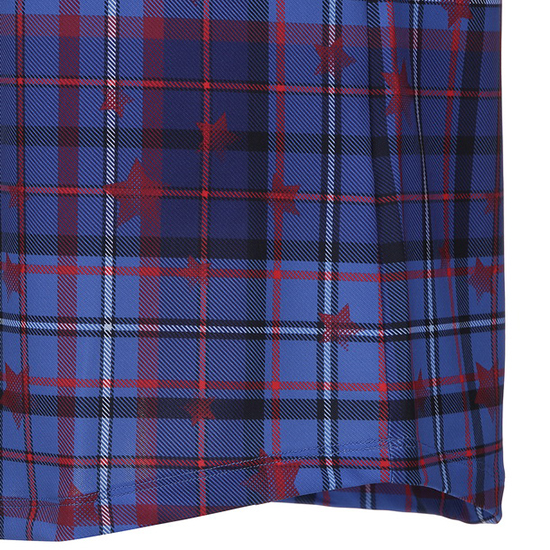 - 컬러 체크 바탕에 별 패턴을 더한 여성 티셔츠.