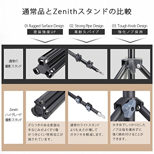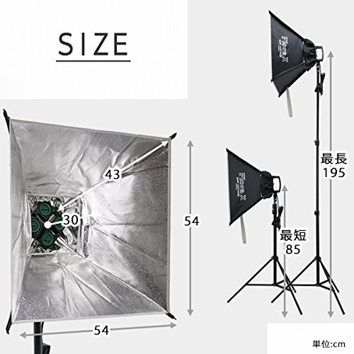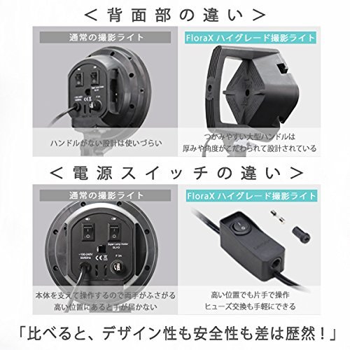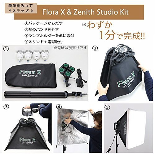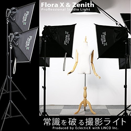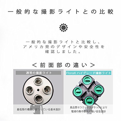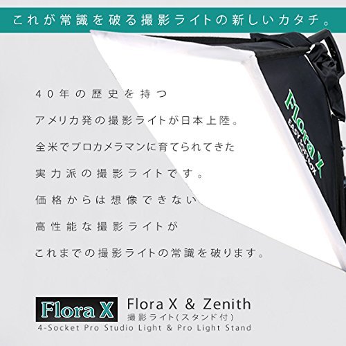 ■FloraX 4灯ランプホルダー■ 【ソケット規格】E26口金 高絶縁セラミックス製 ×4 絶縁ゴム製キャップ ×4 付属 【ACケーブル長】240cm 安全ヒューズ内蔵 手元ON/OFFスイッチ 【16mmメスダボ仕様】 【角度調節しやすいハンドル付エルゴノミクス・デザイン】 【汚れや異物混入を防止するソケットキャップ付】 ■FloraX 専用ソフトボックス■ 形状記憶合金製 折畳式 ワンタッチ・オープン型 専用ディフューザー付属 【サイズ】540mm×540mm 【最大深さ】300mm ■Zenith(ゼニス) ライトスタンド■ 防傷特殊塗装スチール合金製 3段伸縮 【脚径】25.4mm/22.2mm/19mm 【伸長】850mm~2000mm ノンスリップツイストロック 【収納サイズ】710mm×60mm 【16mmオスダボ固定仕様】 床への傷を防止するフットプロテクター付 ※ご注意ください 当商品はお客様の様々なニーズにお答えするために 電球は別売りとさせていただいておりますFeature