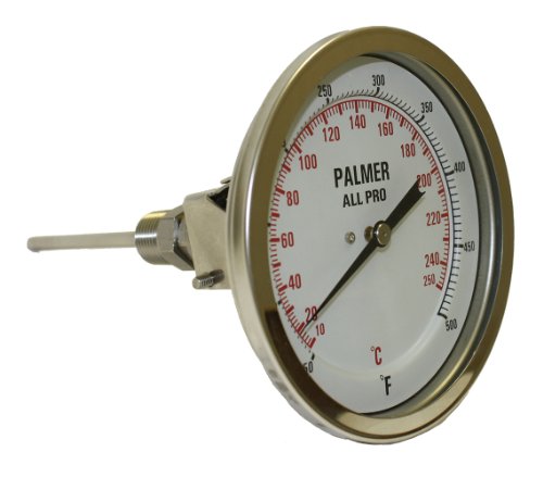 Palmer 5AP90/250F&C All Pro Welded Stainless Steel 304 Dual Scale Bimetal Thermometer, 0/250 F and -20/120 C Range, 5" Dial, 9" Stem, 1/2" NPT Connection, All-Angle Mount