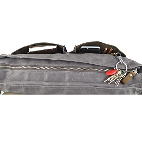 -. Feature : Water resistant canvas with genuine leather exterior, flapover construction, fully lined interior and button closure / Under the flap includes two open top pockets, One open top pocket includes a cell phone holder, pen loops and key slots; the second is fit for ipad, or other small documents / Two Main compartment are divided by padded cloth, the computer pocket to accommodate most laptops with up to a 15.6" screen, the other is suitable for small A4 folder,books and so on / Permanent,adjustable and padded shoulder straps with premium leather overlay / Size: 38cm (14.96") x 30cm (11.81") x 14cm (5.52")