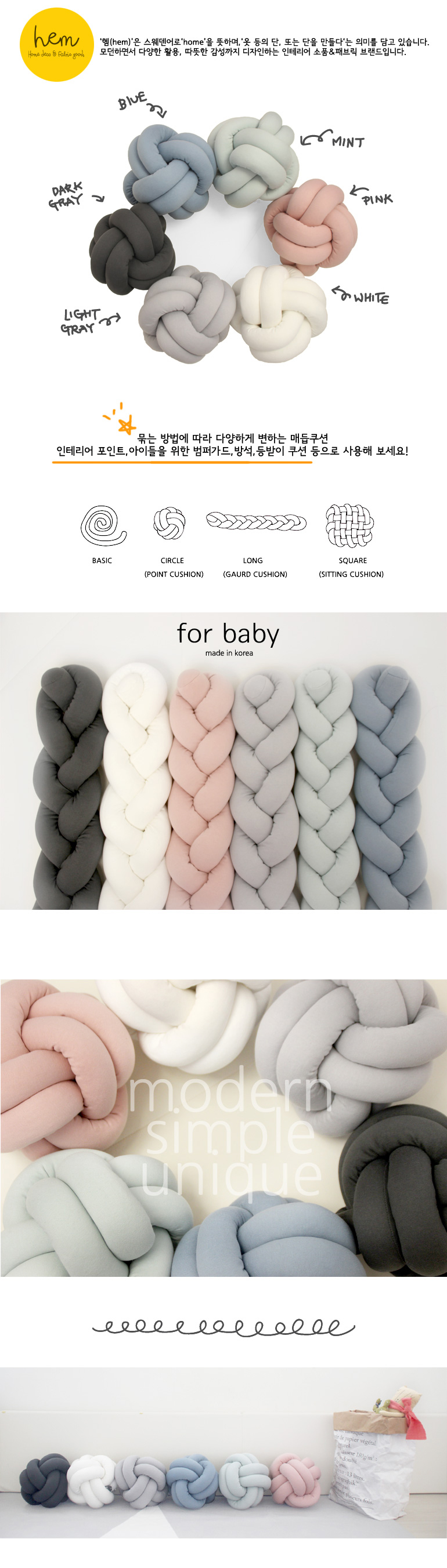 긴 원통형 쿠션을 가드쿠션이나 방석, 또는 다양한 매듭으로 변형해서 사용하는 제품입니다.