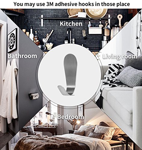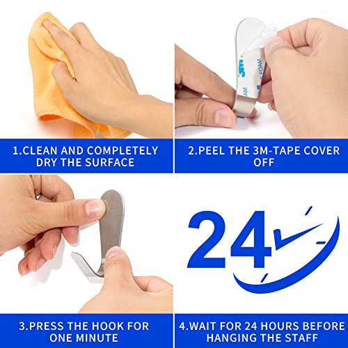 - 【Adhesive】Back of hooks is 3M foam self-adhesive tape with strong adhesiveness, providing up to 5.5 lb (2.5 KG) load-bearing. No punch, no damage to the surface of glass, wood, wall, ceramic tile when removing.