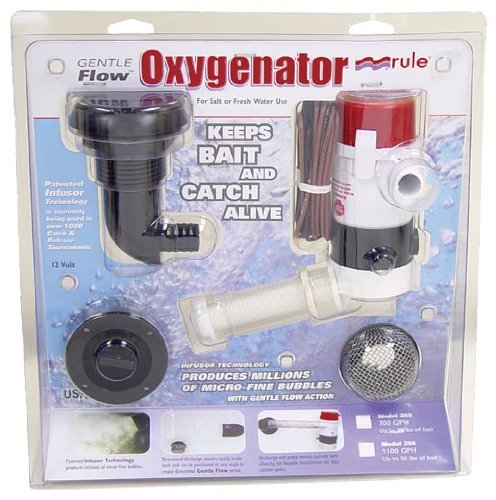 -. Binding : Automotive -. Brand : Rule -. EAN : 0042237085825 -. Feature : Ideal for 25 pounds of bait / Designed with patented infused technology and a gentle-flow Directional discharge, the ideal System for keeping bait and catch alive and healthy / Introduces air into the base of the live well pump through the air control center producing millions of micro-fine bubbles / Designed to fit almost any Custom tank / Kits come complete with a pump, Directional discharge, intake strainer, hose and intake valve -. IsAdultProduct : 0 -. IsAutographed : 0 -. IsMemorabilia : 0 -. Label : Rule -. Manufacturer : Rule -. ManufacturerPartsWarrantyDescription : Parts -. Model : 255 -. MPN : 255 -. NumberOfItems : 1 -. PackageQuantity : 1 -. PartNumber : 255 -. ProductGroup : Automotive Parts and Accessories -. ProductTypeName : SPORTING_GOODS -. Publisher : Rule -. Size : volts = 12v | outlet size = none | inlet style = n -. SKU : 116726 -. Studio : Rule -. Title : Rule 255 700 GHP Gentle-Flow Marine Oxygenator Kit -. UPC : 042237085825