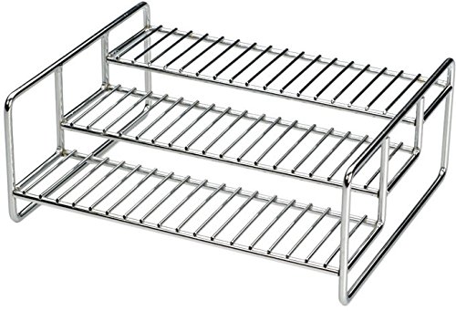 This chromed steel 3-tiered rack can hold spice cans, glass spice bottles, soup cans, etc.