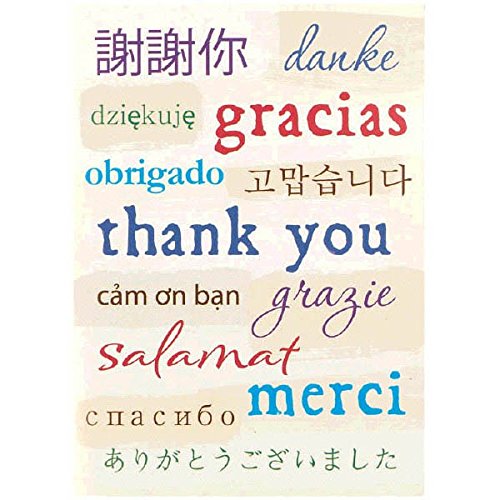 - Features the phrase "Thank You" written in thirteen different languages in a variety of fonts and colors against a white background