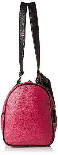 Shoulder bag with debussed front logo design, nylon zipper pocket on sides, pyramid stud detail on front, satin bow at front left ring and back embossed polyurethane leather logo patch.