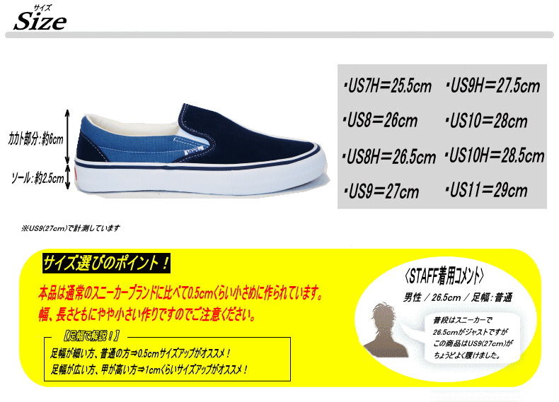 | 商品説明 | <BRAND STORY> VANSの創業は1966年。 南カリフォルニアにて、カジュアルフットウェアの製造業者として誕生しました。バルカナイズ製法のスニーカーは、地元サーファー、スケーター,BMXライダーたちを中心に人気爆発。不変のデザイン、豊かなカラーバリエーションが人気です。スケボシューズが次々とハイテク化していく中で、ほとんどモデルチェンジされずに、ベストセラー商品となっている、シンプルな型が人気の秘密です。 <ITEM INFO> ・大人気スニーカーブランドのUSA企画モデルです。 ・VANSの代表するクラシックモデル・SLIP ON(スリッポン)。 ・クラシックなデザインがどんなスタイルにもマッチ! ・ヒモなしタイプで脱ぎ履きがスムースです。 ・シンプルなデザインと履きやすさが売りの人気アイテムです。 ・往年の名作SLIPONをプロスケート仕様にアップデートしたモデル。 ・前後に衝撃吸収材を配置したカップインソールなど,クラシカルな見た目とは裏腹に最新の技術を駆使したプロ仕様の1足となっています! |