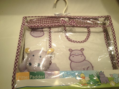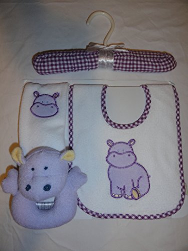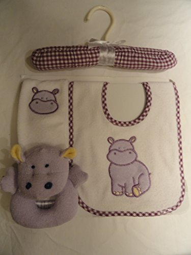 -. Feature : Hippo Baby Gift Set includes: Bib (one size fits all), washcloth, rattle, and matching hanger / 70% cotton, 30% polyester / Machine wash warm, tumble dry medium