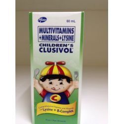-. Binding : Health and Beauty -. Brand : Clusivol -. EAN : 4800153811333 -. Feature : Children's Clusivol is a comprehensive multivitamin and mineral formula for children 1-12 years old. / It aids in the child's growth and development by stimulating children's appetite and supplements a child's daily nutrient intake. -. IsAdultProduct : 0 -. Label : P.f.i.z.e.r -. Manufacturer : P.f.i.z.e.r -. MPN : Clusivol -. PackageQuantity : 1 -. PartNumber : Clusivol -. ProductGroup : Health and Beauty -. ProductTypeName : HEALTH_PERSONAL_CARE -. Publisher : P.f.i.z.e.r -. Studio : P.f.i.z.e.r -. Title : Clusivol Children's Multivitamins 60ml
