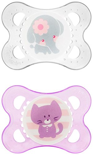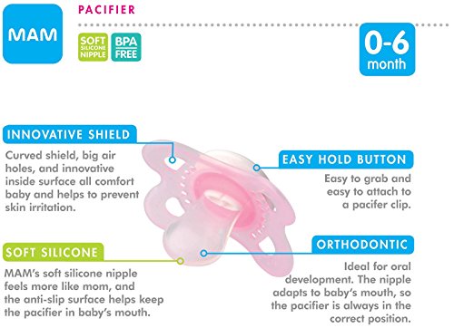 -. Binding : Baby Product -. Brand : MAM -. Color : Pink -. Department : baby-girls -. EAN : 0796629077089 -. Feature : Two BPA-free pacifiers / Curved shield allows the pacifier to sit comfortably on baby's face / MAM Ultra Soft Silicone Nipple stays comfortably in baby's mouth due to the anti-slip texture / Symmetrical nipple ideal for baby's jaw development / Textured surface and multiple small openings on the pacifier shield allow air to circulate and baby's skin to breathe -. Label : MAM -. Manufacturer : MAM -. Model : 1254-012-0-1 -. MPN : 1254-012-0-1B -. PackageQuantity : 1 -. PartNumber : 1254-012-0-1B -. ProductGroup : Baby Product -. ProductTypeName : BABY_PRODUCT -. Publisher : MAM -. ReleaseDate : 2013-10-03 -. Size : 0-6 Months -. Studio : MAM -. Title : MAM Animals Orthodontic Pacifier Girl, 0-6 Months, 2-Count -. UPC : 845296012548