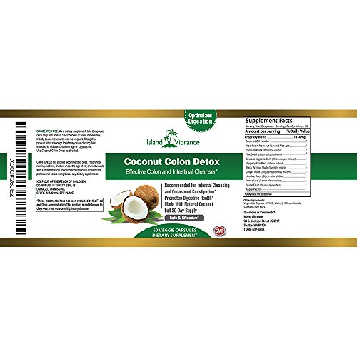 -. Binding : Health and Beauty -. Brand : Island Vibrance -. EAN : 0820103275859 -. Feature : NATURE'S LAXATIVE: Coconut is extremely rich in natural fiber and is commonly referred to as nature's natural laxative. / SAFE AND EFFECTIVE: Experience the improvement in you overall health without unwanted side effects. / OUR GUARANTEE: We are so confident that you will love our products that we offer a 100% Money Back Guarantee. / COCONUT BENEFITS: Coconut oil is high in potent detoxification properties. / GENTLE AND NATURAL: You will be pleased with how coconut oil and our other natural ingredients are easy on your digestive system. -. IsAdultProduct : 0 -. Label : Island Vibrance -. LegalDisclaimer : *The product statements on this page have not been evaluated by the FDA. This product is not intended to diagnose, treat, or cure any disease. Not endorsed by Dr. Oz. -. Manufacturer : Island Vibrance -. MPN : 820103275859 -. PackageQuantity : 1 -. PartNumber : 820103275859 -. ProductGroup : Health and Beauty -. ProductTypeName : HEALTH_PERSONAL_CARE -. Publisher : Island Vibrance -. Studio : Island Vibrance -. Title : Coconut Colon Detox Supplement Super Formula for Cleanse and Weight Loss - Best All Natural Daily Digestive Cleanser and Detoxifier for Maintenance and Flushing Impurities and Toxins - 60 Veggie Capsules -. UPC : 820103275859