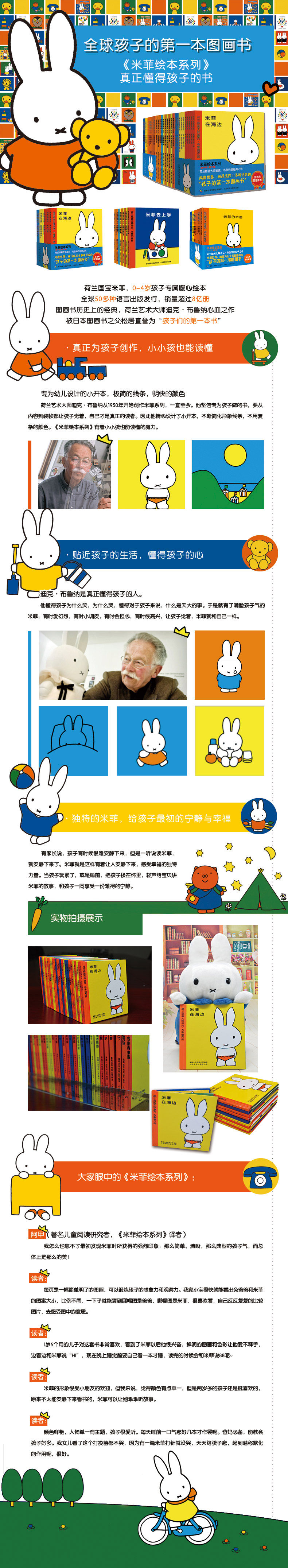 米菲绘本系列是由荷兰插画大师迪克布鲁纳花费数十年心血、精心创作的图画书历史上的经典之作。小兔子米菲迄今已有五十多岁,她和她的亲人、朋友们的故事被翻译成四十多种语言,风靡全世界,陪伴了一代又一代孩子的婴儿期,给他们带去了阅读启蒙。因此,米菲绘本被日本绘本之父松居直先生誉为“孩子的第一本图画书”。