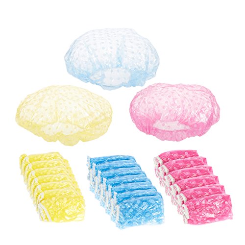 -. Feature : 3 FUN STYLES: Three styles of translucent caps in Blue, Pink and Yellow, each with a polka dot design. / PERFECT FOR HAIR TREATMENTS: Great for perms, conditioners, coloring and treatments. / MULTIPLE USES: Can also be used when bathing, cooking, cleaning or painting. / REUSABLE OR DISPOSABLE: Dispose or reuse, it's your choice. / ONE SIZE FITS MOST: Stretches to fit most heads