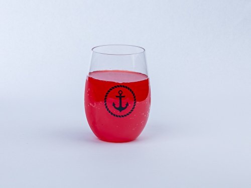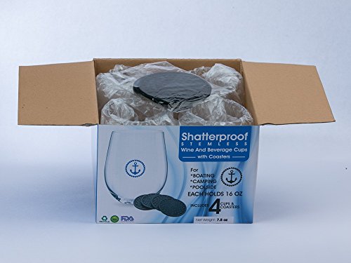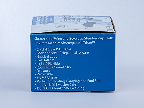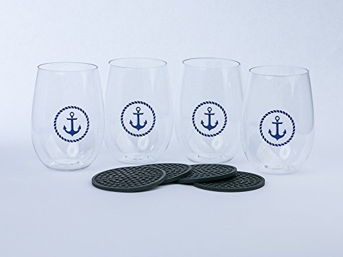 Shatterproof Stemless Nautical Wine & Beverage Cups with coasters- boxed set of 4 cups with anchor logo and 4 silicone coasters