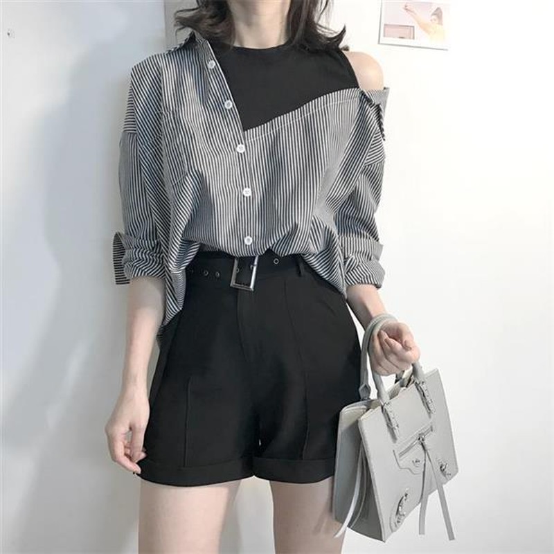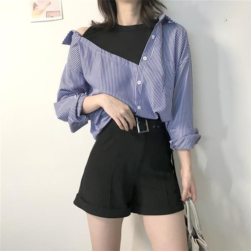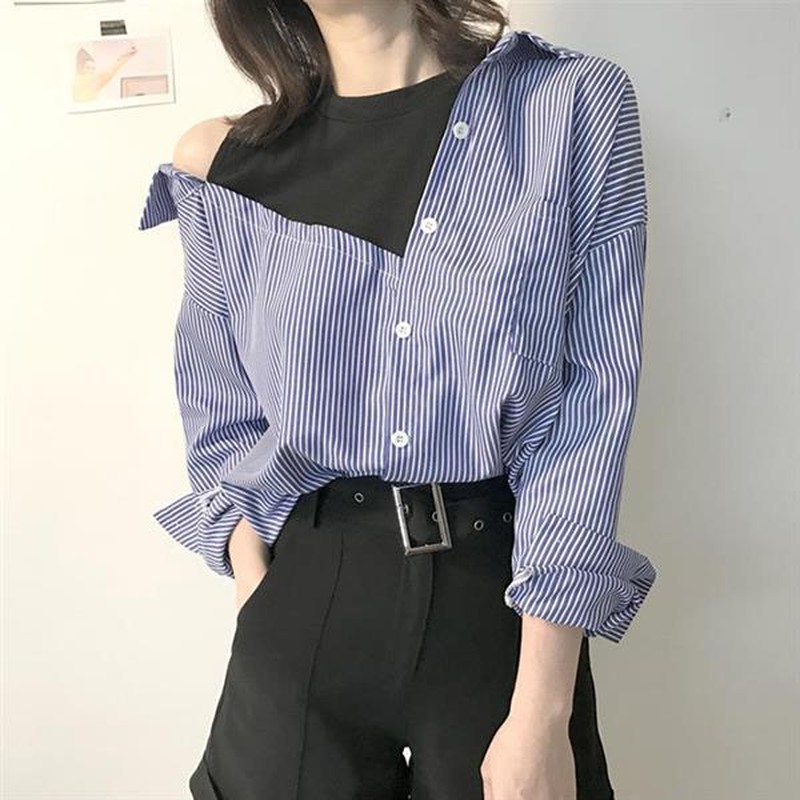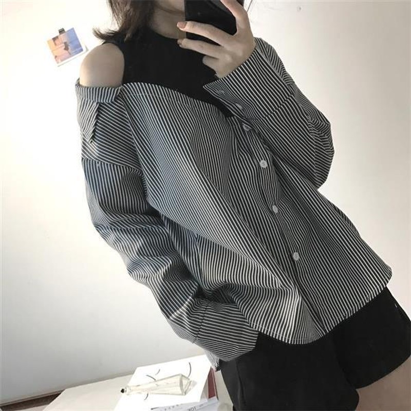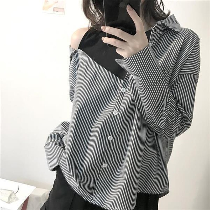 ♢ポイント♢ ストライプ柄のレイヤード風長袖ブラウスです。 カットアウトされたショルダーがアクセントのお洒落なデザイン♪