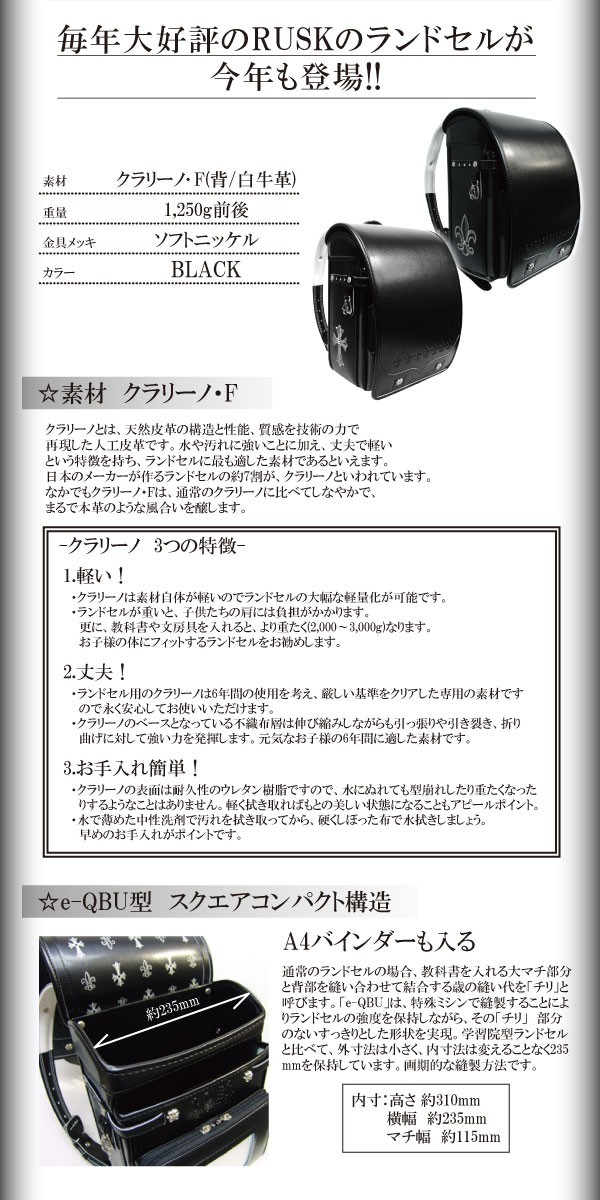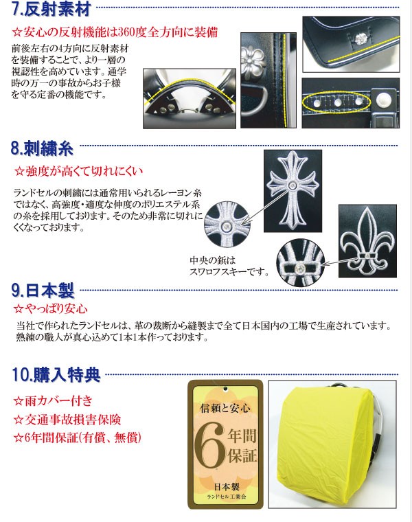 | ・日本製です。 ・A4クリアファイルが入ります ・安心のメーカー6年間保証付!! ・安心の反射素材装備。 ・軽くて、丈夫、お手入れ簡単 ・クラリーノF・アップ式ベルト ・持ち手付き ・オリジナル内張りデザイン ・オリジナルランドセルカバー付 ・施錠はみらくるロック錠 ・安全カバー付・ベルトスライド機能付き ・外寸はそのままで内寸を広くしたスクエア型 ・防犯ブザーを吊るすのにピッタリなフック付 ・ネームカード入れや時間割表付き ・シルバー糸刺繍、スワロフスキー付き ・丈夫なカブゼ付き ・フィットちゃん ・しっかりくん ・らくらくなすカン ・素材へのこだわり ・肩にやさしいベルト形状 |