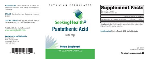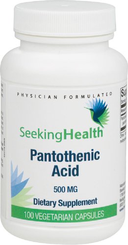 -. Binding : Health and Beauty -. Brand : Seeking Health -. EAN : 0828054137189 -. Feature : Provides 500 mg of pure Pantothenic acid (as d-calcium pantothenate USP) per dose. / Free of Inulin or FOS, Streptococcus, Casein, Corn, Dairy, Egg, Fish, Gluten, Magnesium Stearate , Peanuts, Shellfish, Soy, Titanium Dioxide, Tree Nuts, Wheat. / Pantothenic acid is an essential B vitamin needed to release energy from carbohydrates, protein, and fat in food. / Adrenal fatigue? Tired in the morning or afternoon? Night owl? Low blood pressure? Consider Pantothenic Acid by Seeking Health. / Pantothenic Acid provides vitamin B5 which is one of the number one vitamins utilized by your adrenal glands. Instead of wringing out your adrenals with coffee, fuel them nutritionally with Pantothenic Acid! -. Label : Seeking Health -. Manufacturer : Seeking Health -. MPN : 023-05-001-25 -. PackageQuantity : 1 -. PartNumber : 023-05-001-25 -. ProductGroup : Health and Beauty -. ProductTypeName : HEALTH_PERSONAL_CARE -. Publisher : Seeking Health -. Studio : Seeking Health -. Title : Pantothenic Acid | Provides 500 mg of Pure Pantothenic Acid Vitamin B5 | 100 Easy-To-Swallow Vegetarian Capsules | Free of Common Allergens | Seeking Health -. UPC : 828054137189