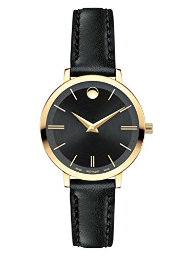 Movado Women's Ultra Slim 28mm Black Leather Band Gold Plated Case Swiss Quartz Analog Watch 0607095