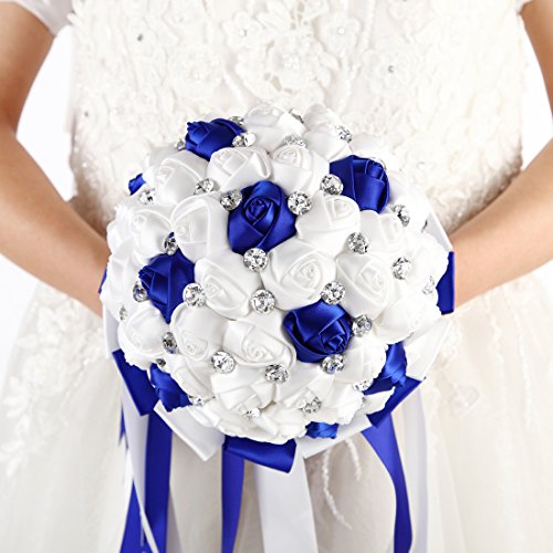 FAYBOX Crystal Satin Rose Bridal Bridesmaid Bouquets Wedding Flower Decor Royal Blue 2