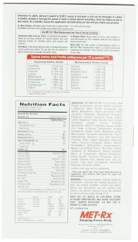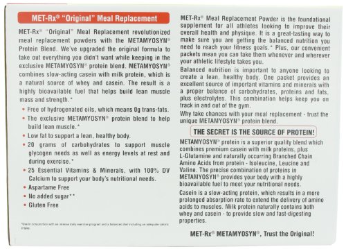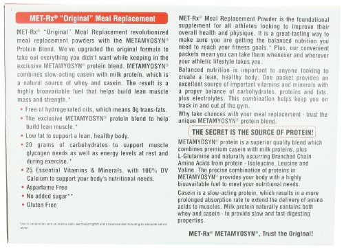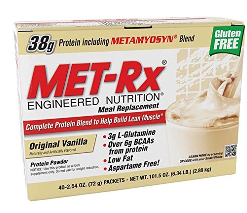 -. Binding : Health and Beauty -. Brand : MET-Rx -. Department : unisex-adult -. EAN : 0794628280929 -. Feature : 40 Packets -. Label : MetRX -. LegalDisclaimer : * These statements have not been evaluated by the Food and Drug Administration. This product is not intended to diagnose, treat, cure or prevent any disease. ** Always refer to the manufacturer's label on the product for description, recommended dose and precautions. -. Manufacturer : MetRX -. Model : 18705 -. MPN : 380187 -. NumberOfItems : 1 -. PackageQuantity : 1 -. PartNumber : 380187 -. ProductGroup : Health and Beauty -. ProductTypeName : HEALTH_PERSONAL_CARE -. Publisher : MetRX -. Size : 40 PK -. Studio : MetRX -. Title : MET-Rx Meal Replacement Powder Boxed - Original Vanilla, 2.54 Ounce, 40-Count Packets -. UPC : 794628280929