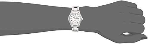 Put the perfect polish on your everyday attire with the Seiko Women's Silvertone Solar Watch. This sporty dress watch has a stainless steel case and bracelet featuring a railroad style white dial with luminous hands and markers. Powered by all types of light, this battery-free watch is water-resistant to 100 meters and has a convenient day and date calendar window. From work, to the weekend and everywhere in between, this stylish watch always keeps you on time.Feature