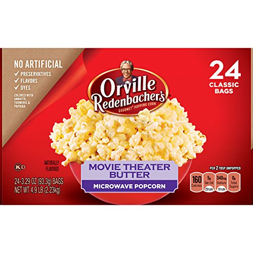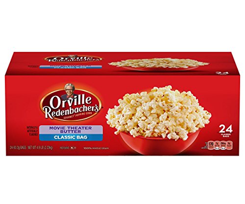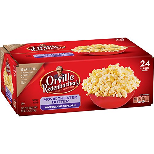 -. Binding : Grocery -. Brand : Orville Redenbacher's -. EAN : 0027000480830 -. Feature : Contains (24) packs of 3.29 oz Orville Redenbacher Movie Theater Butter Popcorn packs; the perfect snack that is light on the butter but full of delicious flavor / Orville Redenbacher Movie Theater Butter Microwave Popcorn has zero grams of trans fat per serving / Orville Redenbacher Microwave Popcorn with Movie Theater Butter is made from 100% whole grains and is a good source of fiber / Orville Redenbacher Gourmet Popcorn uses an exclusive kernel hybrid pops up lighter and fluffier than ordinary popcorn / No other snack draws a crowd like a warm, delicious bowl of popcorn; pop a bag and get ready for company -. Label : Orville Redenbacher's -. Manufacturer : Orville Redenbacher's -. NumberOfItems : 24 -. PackageQuantity : 1 -. ProductGroup : Pantry -. ProductTypeName : GROCERY -. Publisher : Orville Redenbacher's -. ReleaseDate : 2014-04-24 -. Studio : Orville Redenbacher's -. Title : Orville Redenbacher's Movie Theater Butter, 24 Count -. UPC : 027000480830