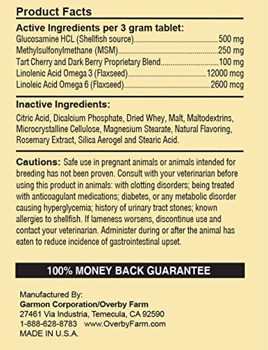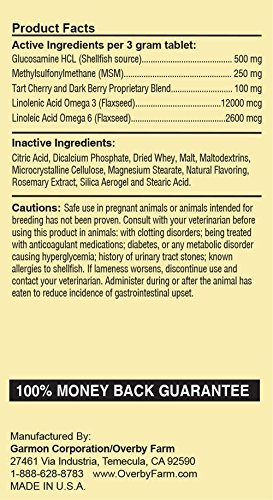 -. Binding : Misc. -. Brand : NaturVet -. Label : NaturVet -. Manufacturer : NaturVet -. PackageQuantity : 1 -. ProductGroup : Pet Products -. ProductTypeName : PET_SUPPLIES -. Publisher : NaturVet -. Studio : NaturVet -. Title : Overby Farm Hip Flex Joint Level 1 Early Care with Tart Cherries for Dogs, Chewable Tablets, Made in USA