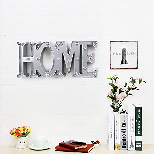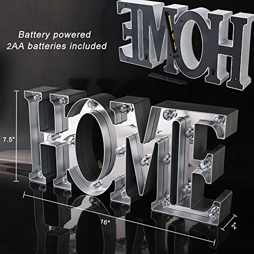 -. Feature : Home Sweet "HOME", Day and Night - "HOME" in Lights (18" x 8" x 2" big sign) - 20 LED bulbs combine a beautiful warm glow with a gorgeous "HOME" - Used as standalone everyday HOME decor - The ultimate display of devotion and affection, creating soothing, relaxing and elegant mood - An eye-catching "HOME", whether the sunrise or sunset - Light up your "HOME"! / Versatile & Portable - Lightweight (2.4lbs); Convenient carrying around - The options are endless - Integrated hanging hook holes for ease of display on wall or just rest on mantle, shelf, table or dresser; As an exciting prop for dessert tables, walls, and photo booths, etc. Pretty much anywhere you can think to use a sign - Wireless and Safe - Uses 2 AA batteries (included), with an on and off switch on the back. / Durable & Energy-Saving - Exceptionally long lifetime - Provide immediate, significant energy savings while enhancing your home atmosphere - Stay cool to the touch after long-time use - Textured ABS exterior - Sturdy; Lightweight; Corrosion-resistant; High temperature resistant. / Great gift idea for any occasion - Comes in a gift box, ready for gift giving to colleagues, friends and loved ones. / DEVOTED CUSTOMER SERVICE - Genuine BRIGHT ZEAL home LED light products - Certified under UL588 and Complies with 16 CFR 1120.3(c) - TRADEMARK filed in U.S.A. - In business since 1997 - For U.S. customers, this product comes with 1-MONTH FREE TRIAL & FREE life time customer service - You can always come to us for free customer service at: http://www.amazon.com/seller/BRIGHT-ZEAL