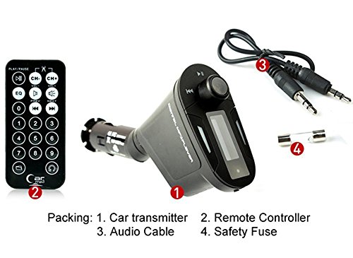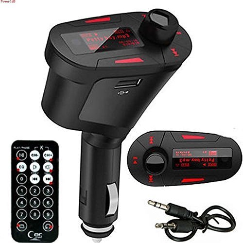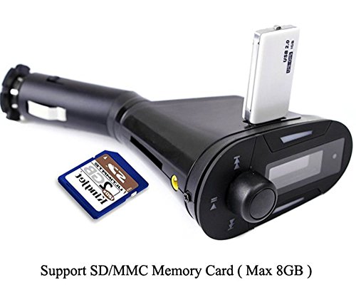 -. Feature : Charge your USB device through the USB port (Charging cable is not included). / With a support of FM channels, this Car MP3 wireless FM transmitter lets you take a break from your regular music. / 360 degree rotation, LCD display and Car charger Function with USB port. / Supports USB flash drives, SD/MMC memory cards and line in from MP3 players (memory card not included). / With small, stylish and lightweight design, the Car MP3 wireless FM transmitter is easy to carry, anywhere you go.