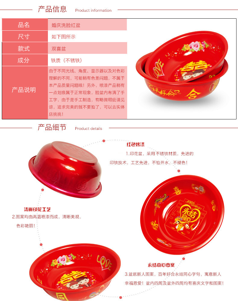 永结同心双喜脸盆 陪嫁结婚喜庆用品 婚庆嫁妆用品红色洗漱双喜盆