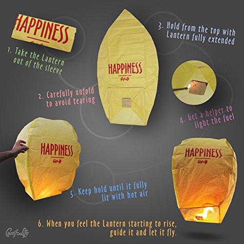 Your time with our sky eco lanterns might be fleeting, but your experience will stay with you for years. And that experience is enhanced by the quality of the ComfoLife fly lanterns. Our wishing lamps are constructed from flame resistant rice paper, high-quality bamboo and have pre-attached cotton fuel. Once lit, our lanterns burn for up to 8 minutes, so they can reach an impressive altitude of 3000 ft. And when your lantern comes to the end of its journey, you'll rest easy knowing that the biodegradable materials won't harm the environment.