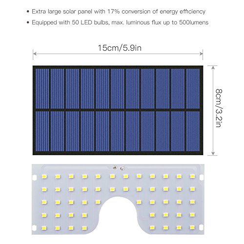 SUPER BRIGHT--The newest Volador outdoor solar lights adopt 50pcs LED, providing a excellent illumination up to 500lumens. This is bright enough to see everything at night and offer security and safety protection for your home.