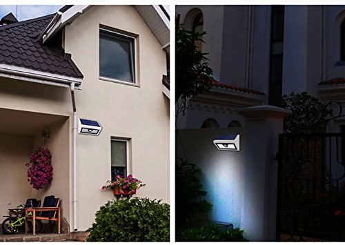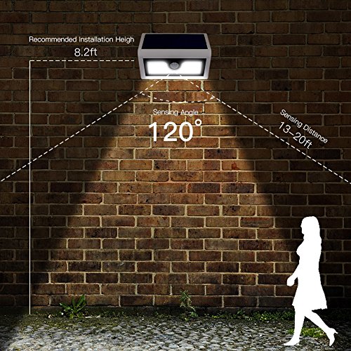 LARGER SENSING AERA--sensing range of 10 feet with a 120 degree sensing angle. IP65 waterproof and heatproof solar powered lights, suitable for most kinds of weathers.