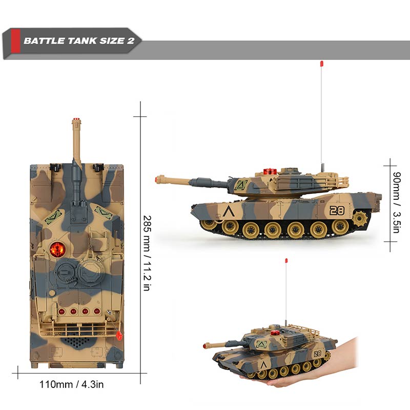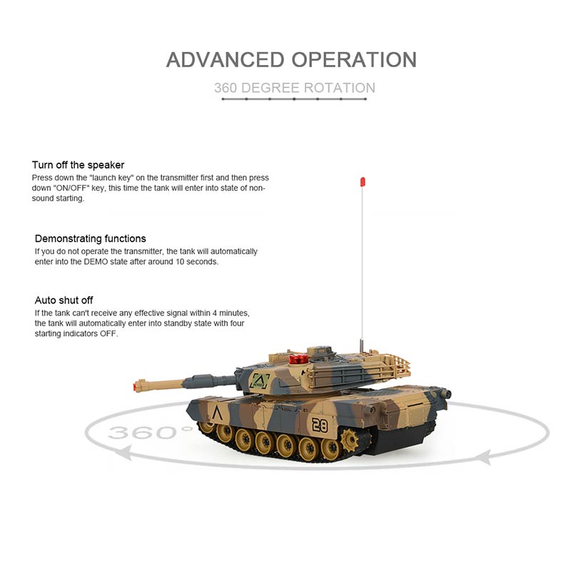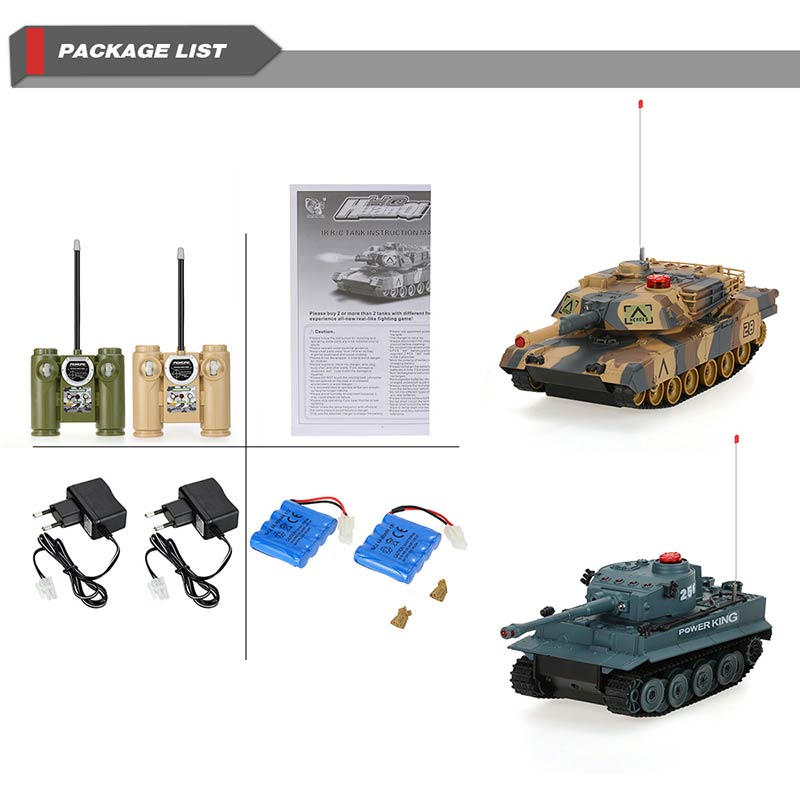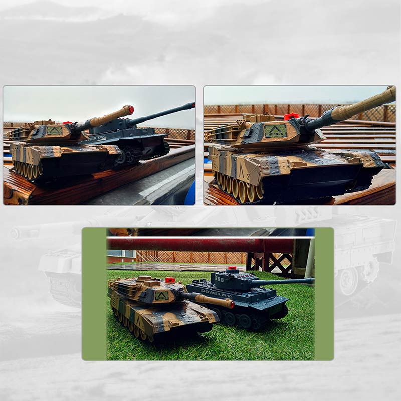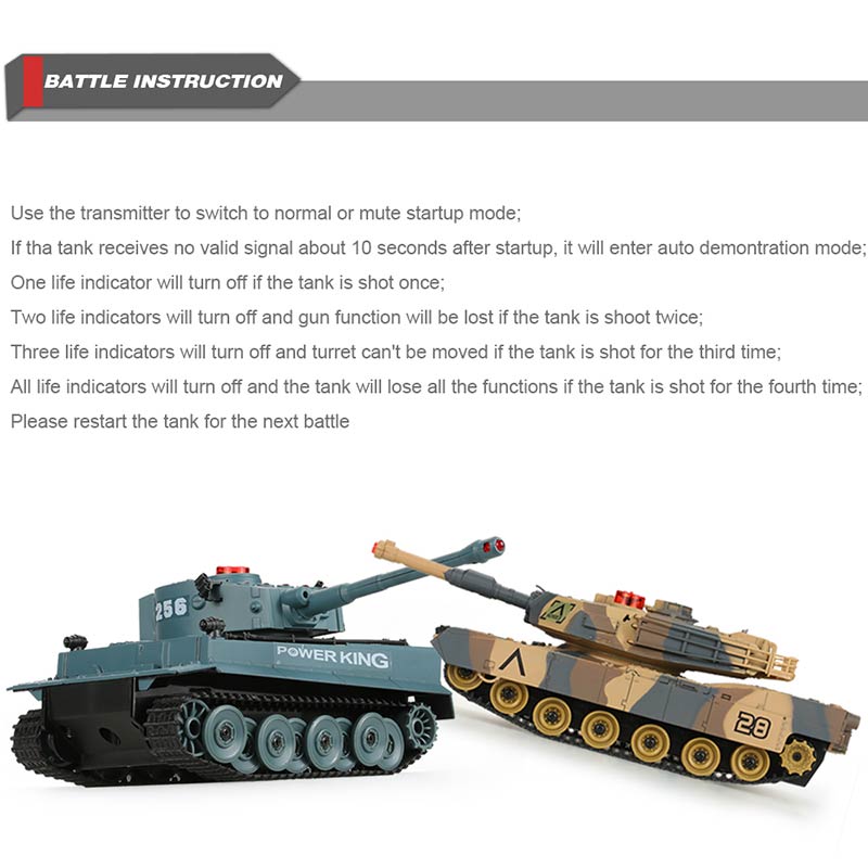 These two Infrared Fighting RC Battle Tank were designed based on the USA M1A2 and German Tiger 1 H1 tank. They have the function of auto shut off and sound/non-sound mode. If you do not operate the transmitter, the tank will automatically enter into the DEMO state. Besides, the gun tube can moves up and down, the turret can freely turns 320 degrees. Moreover, they have the function of infrared fighting. Two or more children can play them together, develop their intelligence. So don't hesitate to take it home, it will surprise you as a gift!