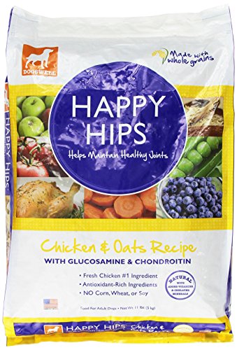We know how much dogs love running laps around the house and chasing friends at the dog park. It’s why we created Happy Hips dry dog food- to help keep them happy and healthy. Happy Hips Chicken & Oats Recipe is crafted with real chicken, wholesome fruits and veggies, and supplements that help sustain hip and joint health. Every dash to the dinner bowl means it’s working!FEEDING GUIDELINES: Amount of food your dog requires will depend on activity, age, size, environment, and breed. Feed at room temperature and refrigerate unused portion. Always provide access to fresh water. Adult: Feed 1 1/4 to 1 1/2 cans per 15 lbs of body weight per day. Daily Feeding Guidelines: Dog Weight (lbs) Dry Food (cups) 10 or less ¼ - 1 11 - 20 1 - 1 ¼ 21 - 40 1 ¼ - 2 41 - 60 2 - 2 ½ 61 - 80 2 ½ - 3 81 - 100 3 - 3 ½ 101 - 120 3 ½ - 4 For dogs over 120 lbs: Add ¼ cup per additional 10 lbs. Based on a standard 8 oz measuring cup. Fresh water should be available at all times. Optimal feeding amounts may vary with age, size, breed, and activity level. Please use the feeding guidelines as an initial recommendation and adjust food amount as needed. Duck, Chicken Broth, Water Sufficient For Processing, Chicken Liver, Chicken, Dried Egg Product, Peas,Salmon, Guar Gum, Carrots, Natural Flavor, Red Peppers, Shrimp Meal, Sodium Tripolyphosphate, Canola Oil, Salt, Potassium Chloride, Minerals (Zinc Amino Acid Chelate, Iron Amino Acid Chelate, Copper Amino Acid Chelate, Manganese Amino Acid Chelate, Sodium Selenite, Cobalt Amino Acid Chelate, Potassium Iodide), Flaxseed Oil, Garlic Powder, Vitamins (Vitamin E Supplement, Thiamine Mononitrate, Niacin Supplement, d-Calcium Pantothenate, Vitamin A Supplement, Riboflavin Supplement, Biotin, Vitamin B12 Supplement, Pyridoxine Hydrochloride, Vitamin D3 Supplement, Folic Acid), Choline Chloride, Chondroitin Sulfate, Dried Spinach, Dried Cranberries, Dried Blueberries, Dried Zucchini, Dried Squash, Taurine, Tricalcium Phosphate, Glucosamine Hydrochloride. Chicken, Chicken Meal, Oats, Barley, Peas, Brown Rice, Natural Flavor, Chicken Fat (Preserved with Mixed Tocopherols), Flaxseed, Dehydrated Alfalfa Meal, Potassium Chloride, Dicalcium Phosphate, Tomato Pomace, Carrots, Apples, Blueberries, Garlic Powder, Dried Chicory Root, Taurine, Yeast Culture, Minerals (Zinc Proteinate, Iron Proteinate, Copper Proteinate, Manganese Proteinate, Cobalt Proteinate, Sodium Selenite), Vitamins (Choline Chloride, Vitamin A supplement, Vitamin D3 supplement, Vitamin E supplement, Niacin, d-Calcium Pantothenate, Pyridoxine Hydrochloride (source of vitamin B6), Thiamine Mononitrate, Riboflavin Supplement, Folic Acid, Vitamin B12 Supplement), Lactobacillus casei Fermentation Product Dehydrated , Lactobacillus acidophilus Fermentation Product Dehydrated, Bifido bacterium thermophilum Fermentation Product Dehydrated, Enterococcus faecium Fermentation Product Dehydrated, Rosemary Extract.Feature