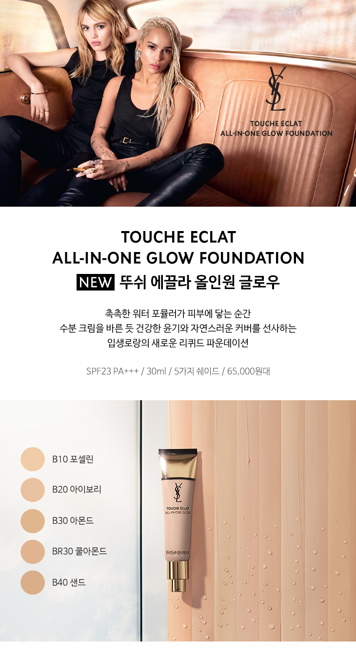 피부에 닿는 순간 수분 크림을 바른 듯촉촉한 워터 포뮬러가 건강한 윤기와 자연스러운 커버를 선사하는입생로랑의 새로운 리퀴드 파운데이션, 뚜쉬 에끌라 올-인-원 글로우