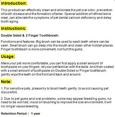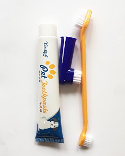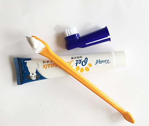 -. Feature : 1.The Dog Dental Care Kit includes: 2 Toothpaste (Beef & Herbs), 2 Finger Toothbrush and 1 Dual Sided Brushes. / 2.This toothpaste can help to keep his breath smelling fresh, can kiss your pet anytime you want. / 3.Effect:Effectively clean and eliminate the pet oral odor , prevention of tooth disease and the formation of tartar. / 4.Safty:Special addition of refined bone meal which is eatable, can alleviate the symp of pet dental calcium deficiency and delay tooth aging / 5.To keep your pet dental health, Clean Teeth Every Day.