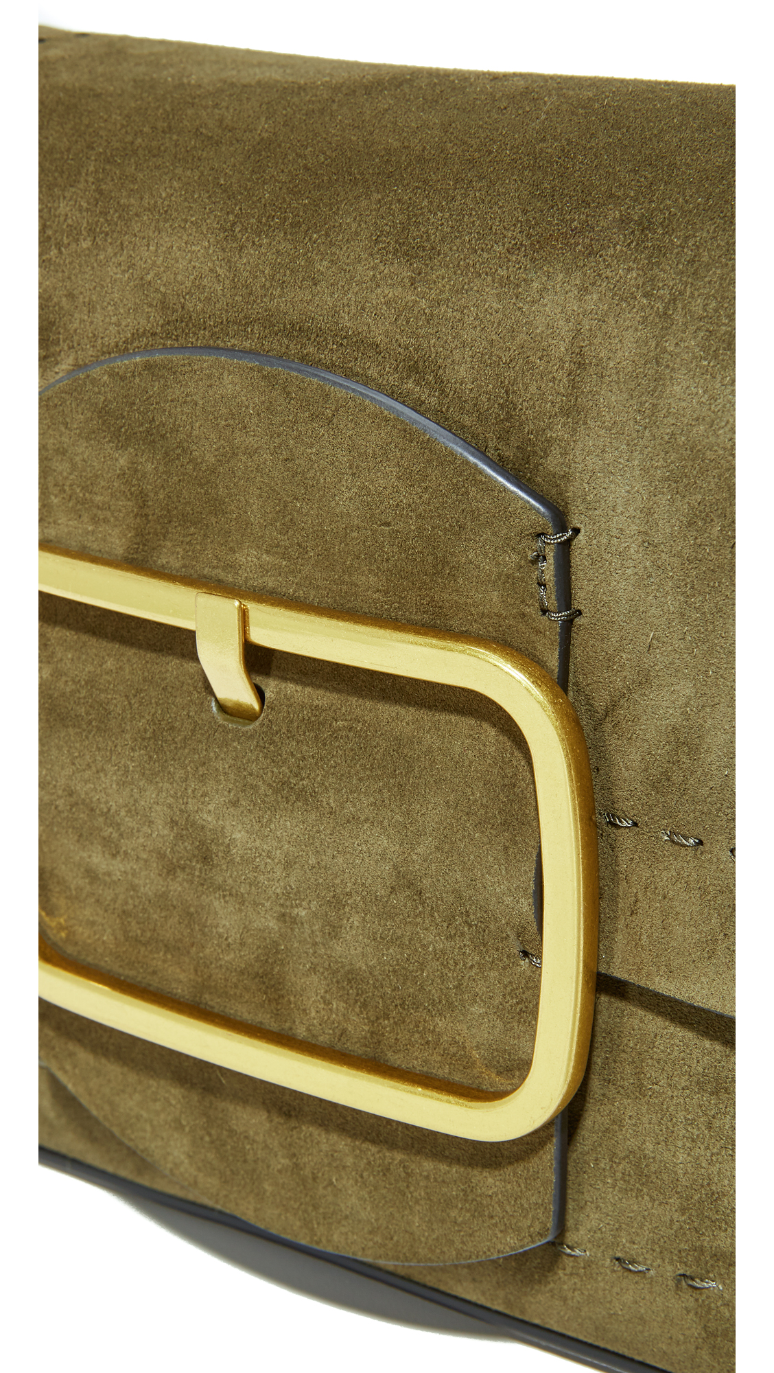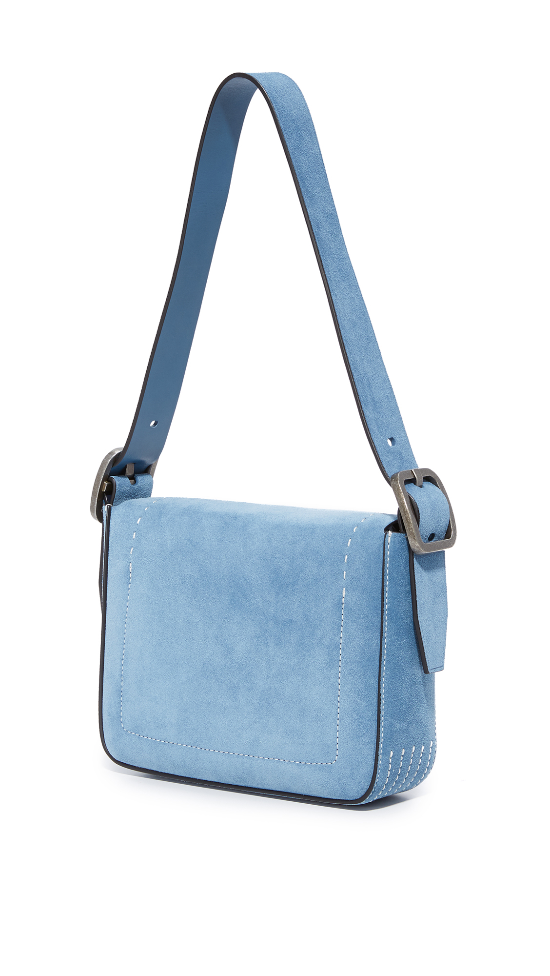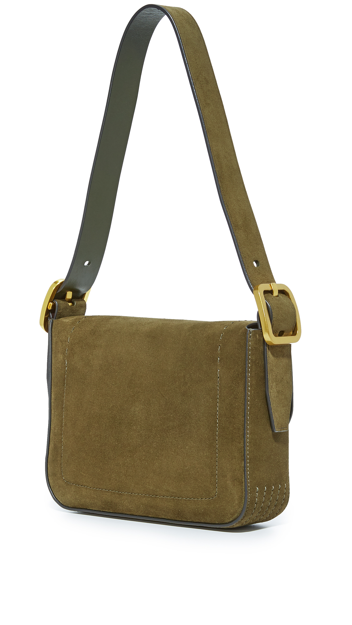 A suede Tory Burch handbag with contrast whipstitching and a decorative buckle. Magnetic top. Unlined, 1-pocket interior. Optional, adjustable shoulder strap. Dust bag included.
