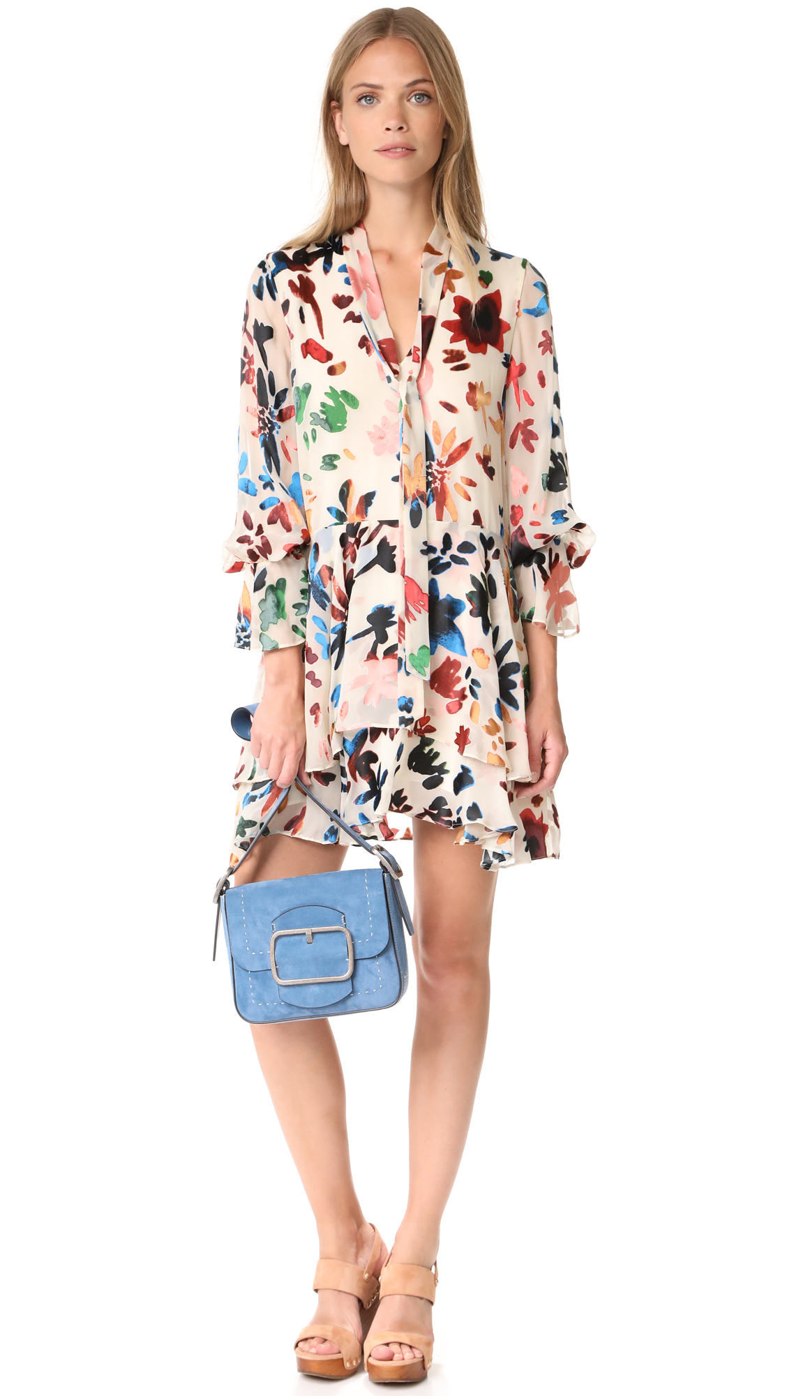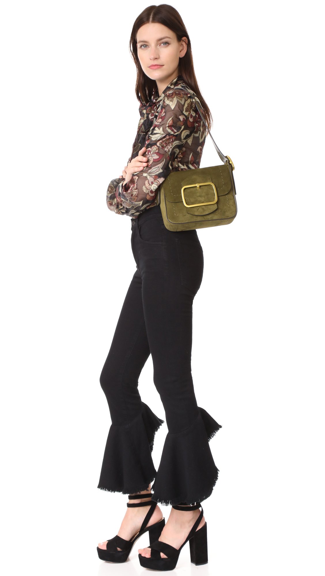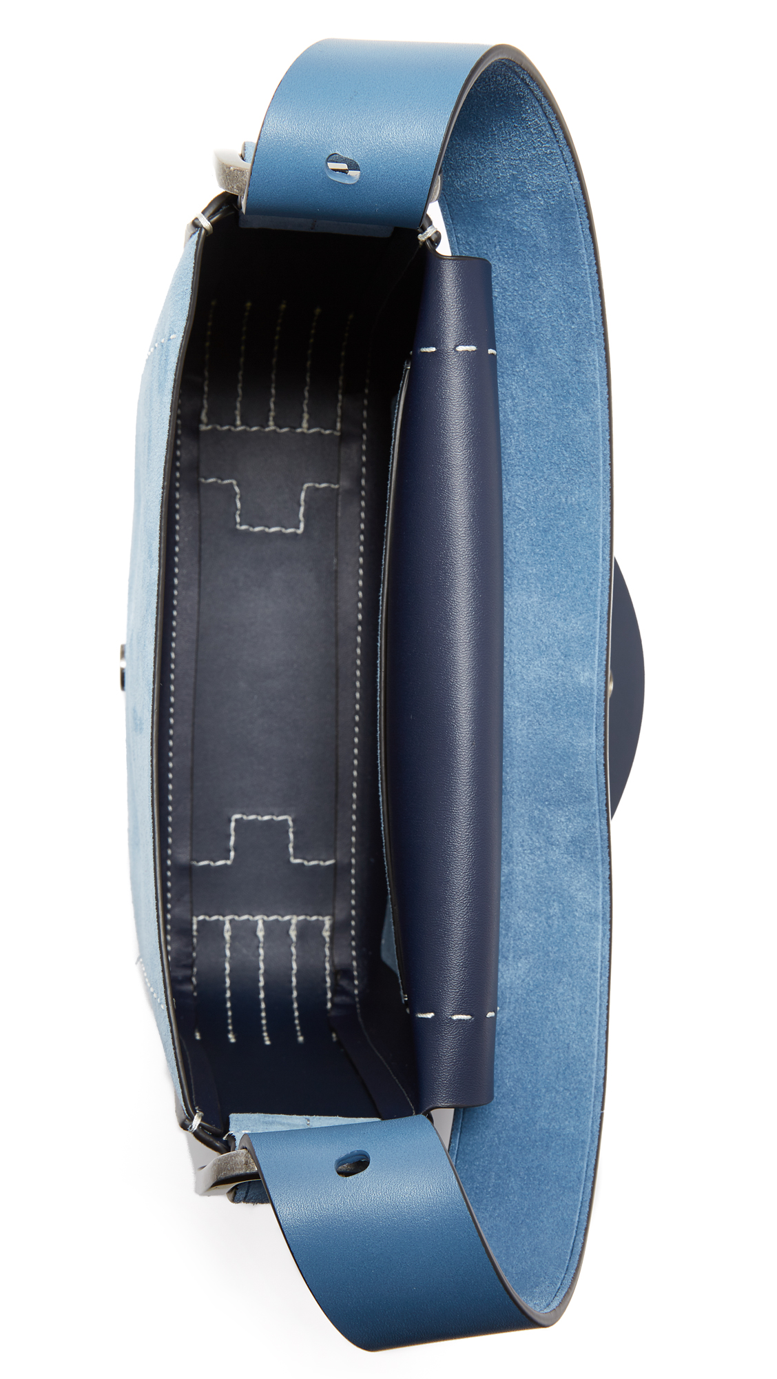 A suede Tory Burch handbag with contrast whipstitching and a decorative buckle. Magnetic top. Unlined, 1-pocket interior. Optional, adjustable shoulder strap. Dust bag included.