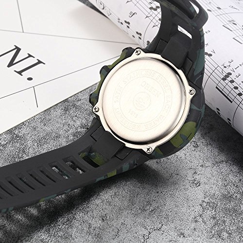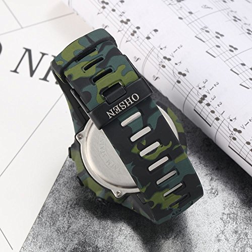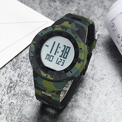 -. Feature : The creative green camouflage digital outdoor sport watch is nice. Time is precise. Stylish, attractive for boys and girls. It is the best choice! This watch is great for any child that likes the camouflage style. The soft rubber band is very flexible. The watch is great quality and looks very stylish for the price. / High quality environment friendly rubber strap is soft, comfortable, safe non-toxic, easy to put on and take off. Love children, from time to time. It is bright and great for kids learning to manage time. Great watch good price! Cool and rugged watch, will give kids an unforgettable childhood! / Camouflage rubber case and strap. Digital dial. Buckle clasp. 46mm case diameter. 15mm case thickness. 24mm band width. 23.5cm bracelet length. The strap adopts environmental protection material, protect the healthy growth of child. Week alarm display. EL lamp, press "LIGHT" button to see the time clearly. / Functions: single-chip number, alarm clock, hour, LED display, stopwatch. Applicable occasions: outdoor sports activities, student sports classes, students' lessons. When exercising, it is reasonable to help the child to plan the exercise time, make the child move more comfortable. / Not suitable for shower, swimming and diving. The band is made of high polymer material, and it's skin friendly. You can use cotton cloth to clean it.