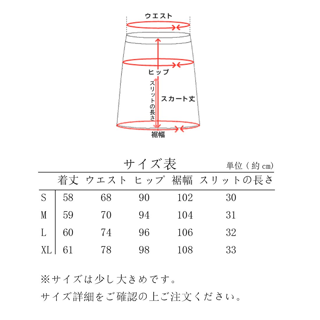 S Length about 58 Waist about 68 hips about 90 hem width about 102 slit length about 30