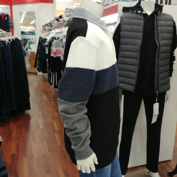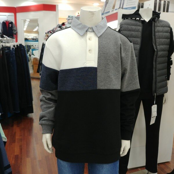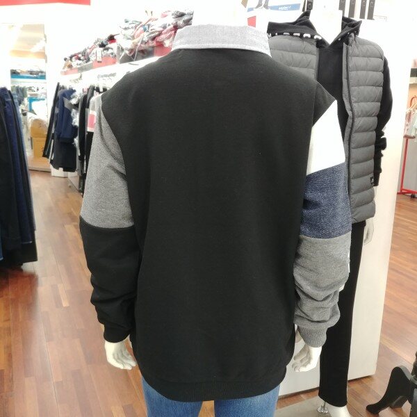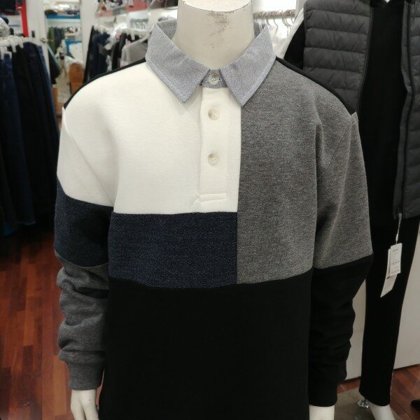 얇은 기모가 있는 겨울 카라 티셔츠입니다.점퍼 입기전 스산한 늦가을에서 겨울 봄까지 입을 수 있는 티셔츠입니다.블랙과 언발란스 느낌이 주는 절개 디자인이 포인트입니다.